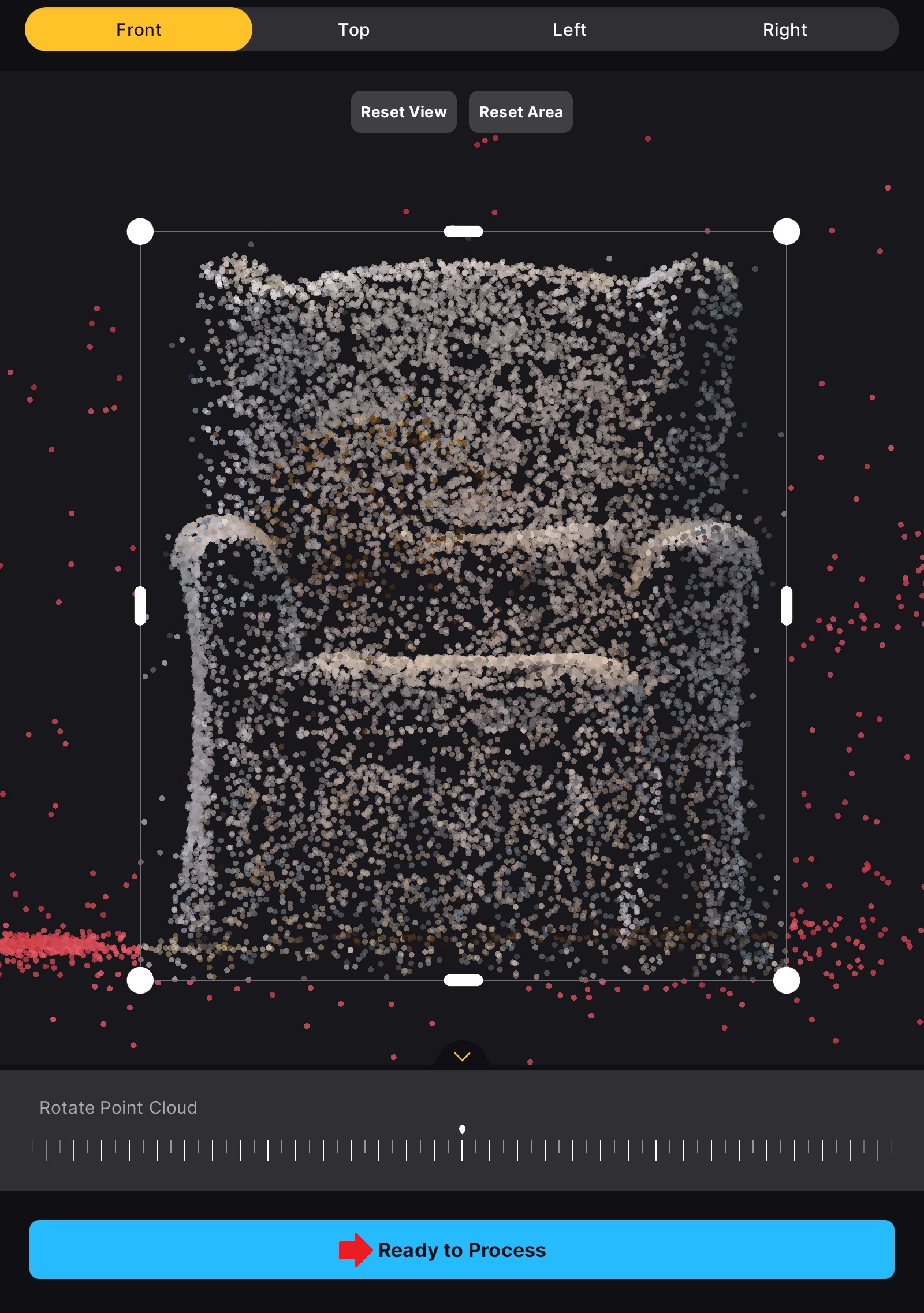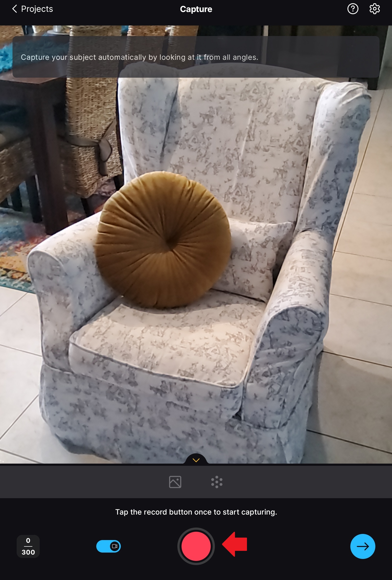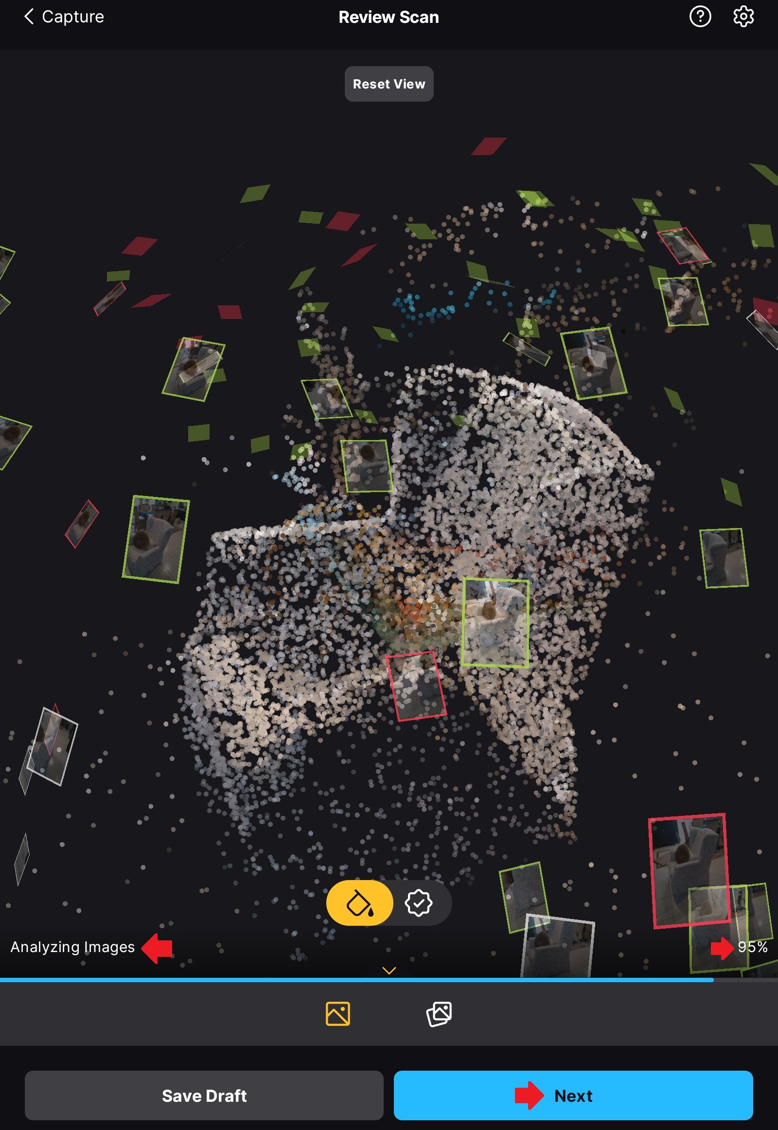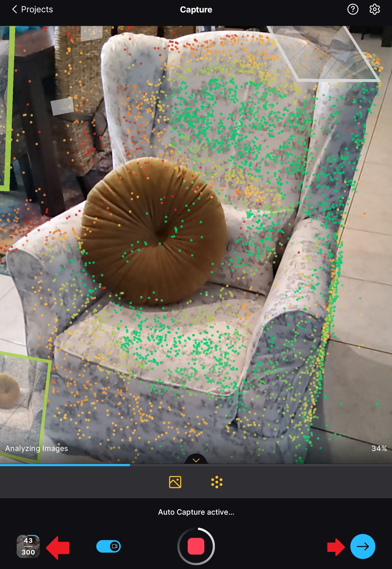 Appuyez sur le bouton rouge pour lancer la capture, et déplacez-vous lentement autour de l'objet. Le compteur de photos s'affiche en bas à gauche. Au bout d’un certain temps, un nuage de points apparaîtra. Les zones rouges indiquent les endroits insuffisamment couverts par les photos : concentrez-vous alors sur celles-ci (sans négliger les autres).