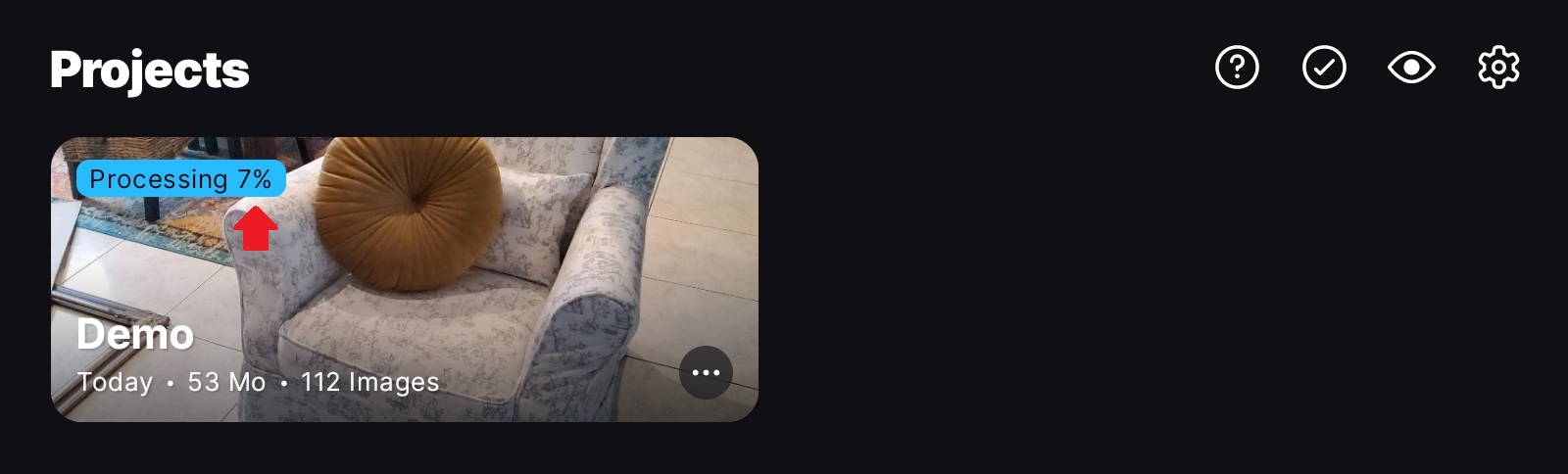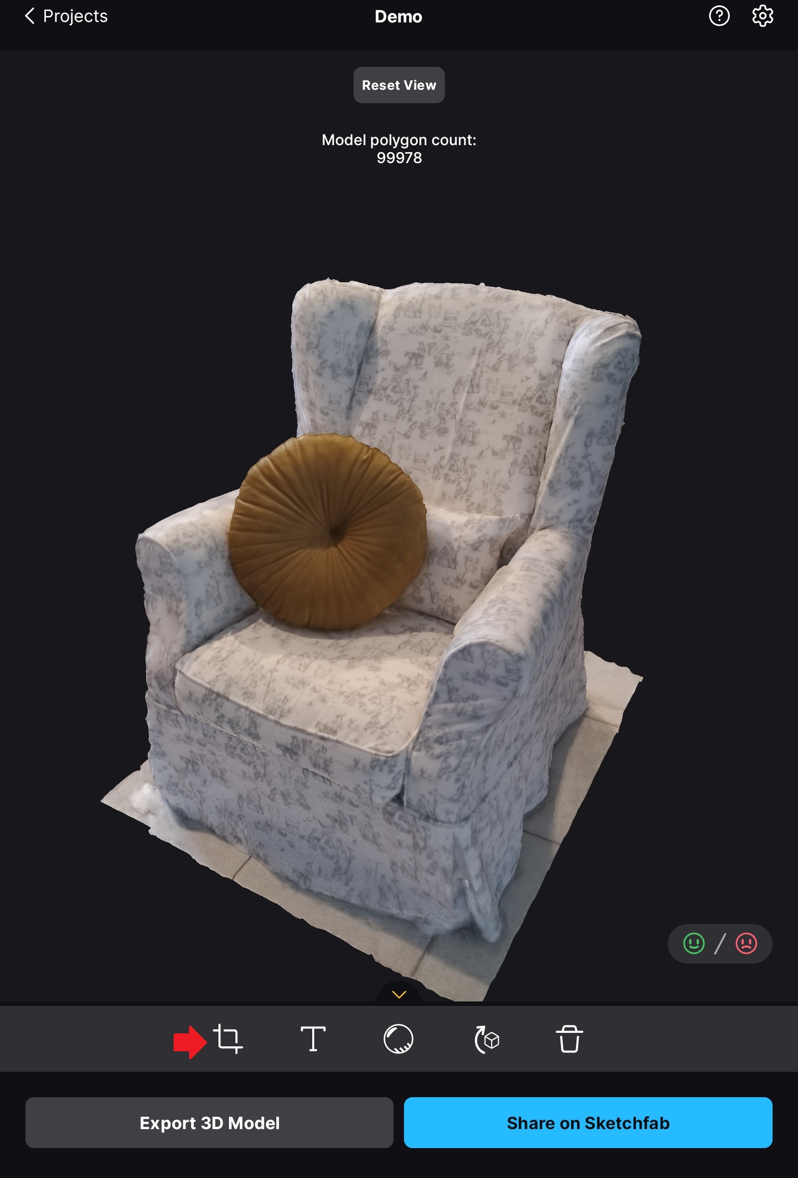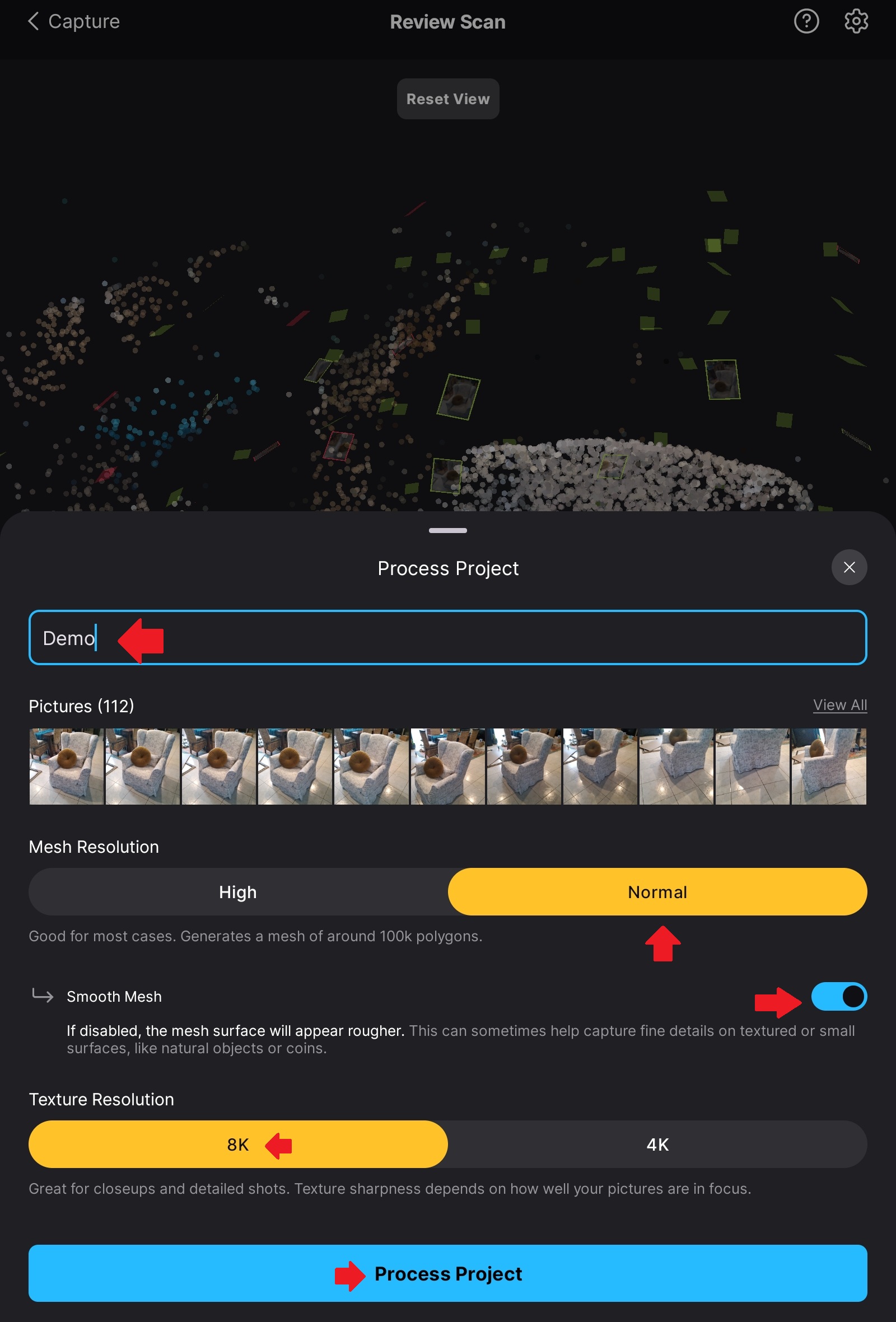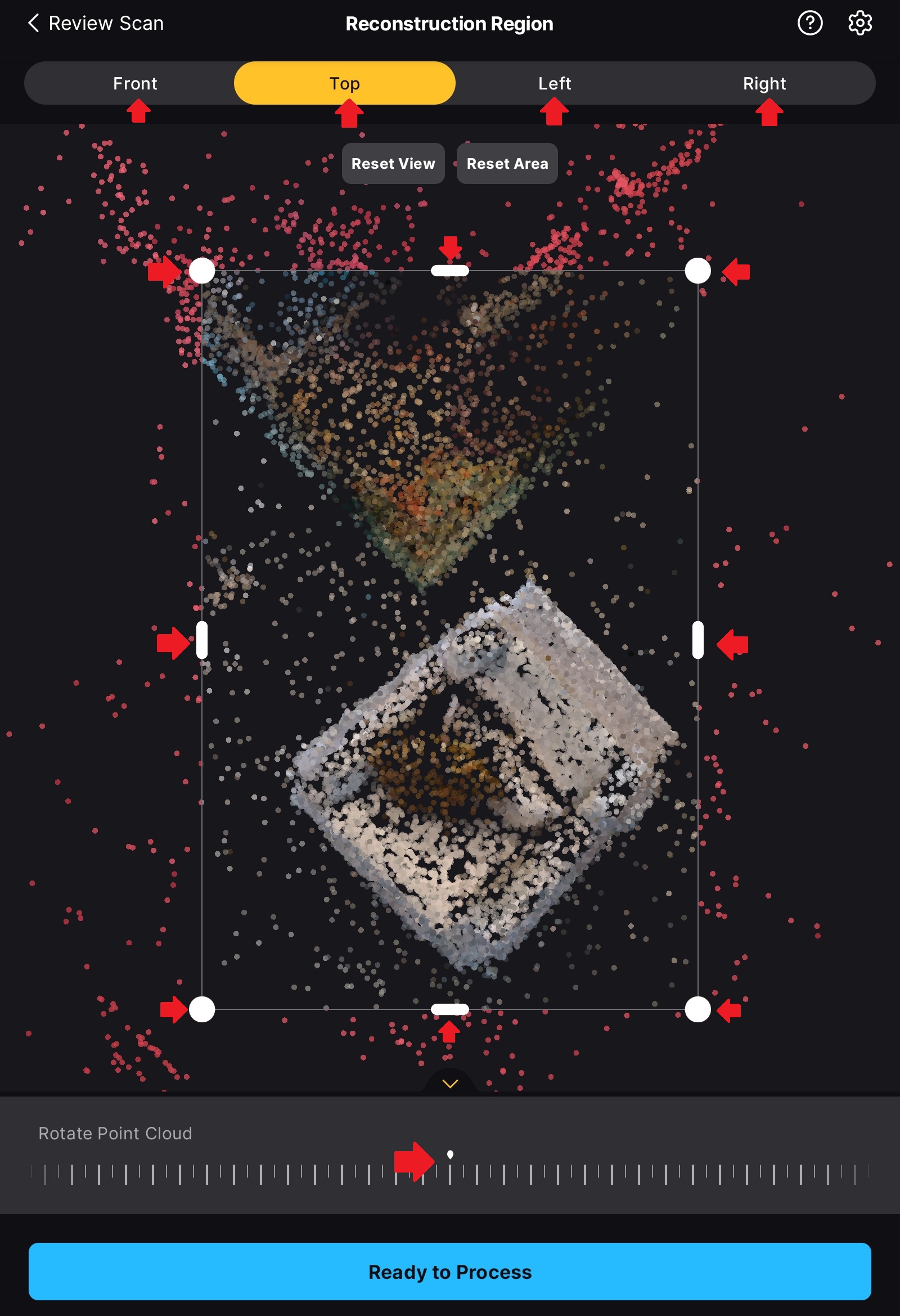 Appuyez sur le bouton rouge pour lancer la capture, et déplacez-vous lentement autour de l'objet. Le compteur de photos s'affiche en bas à gauche. Au bout d’un certain temps, un nuage de points apparaîtra. Les zones rouges indiquent les endroits insuffisamment couverts par les photos : concentrez-vous alors sur celles-ci (sans négliger les autres).