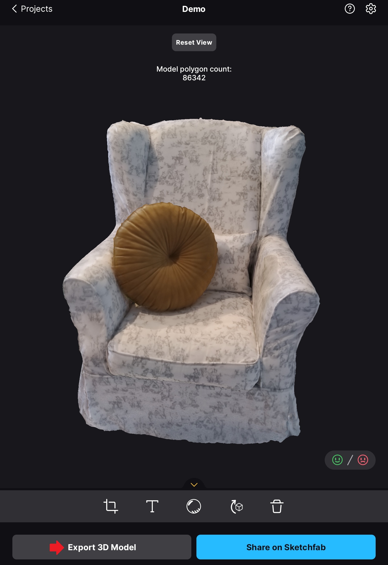 Dans l'exemple ci-dessus, le fauteuil présenté à droite a servi de modèle pour réaliser le modèle 3D affiché à gauche en réalité augmentée, tout cela en quelques minutes et sans modélisation préalable !