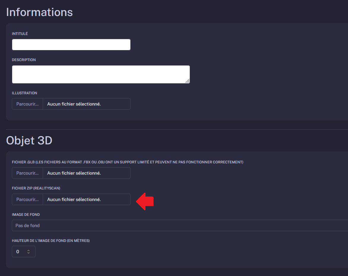Vous arrivez ensuite sur la page d’ajout. Renseignez la description, importez le fichier .zip précédemment exporté dans le champ "RealityScan", puis cliquez sur "Valider".