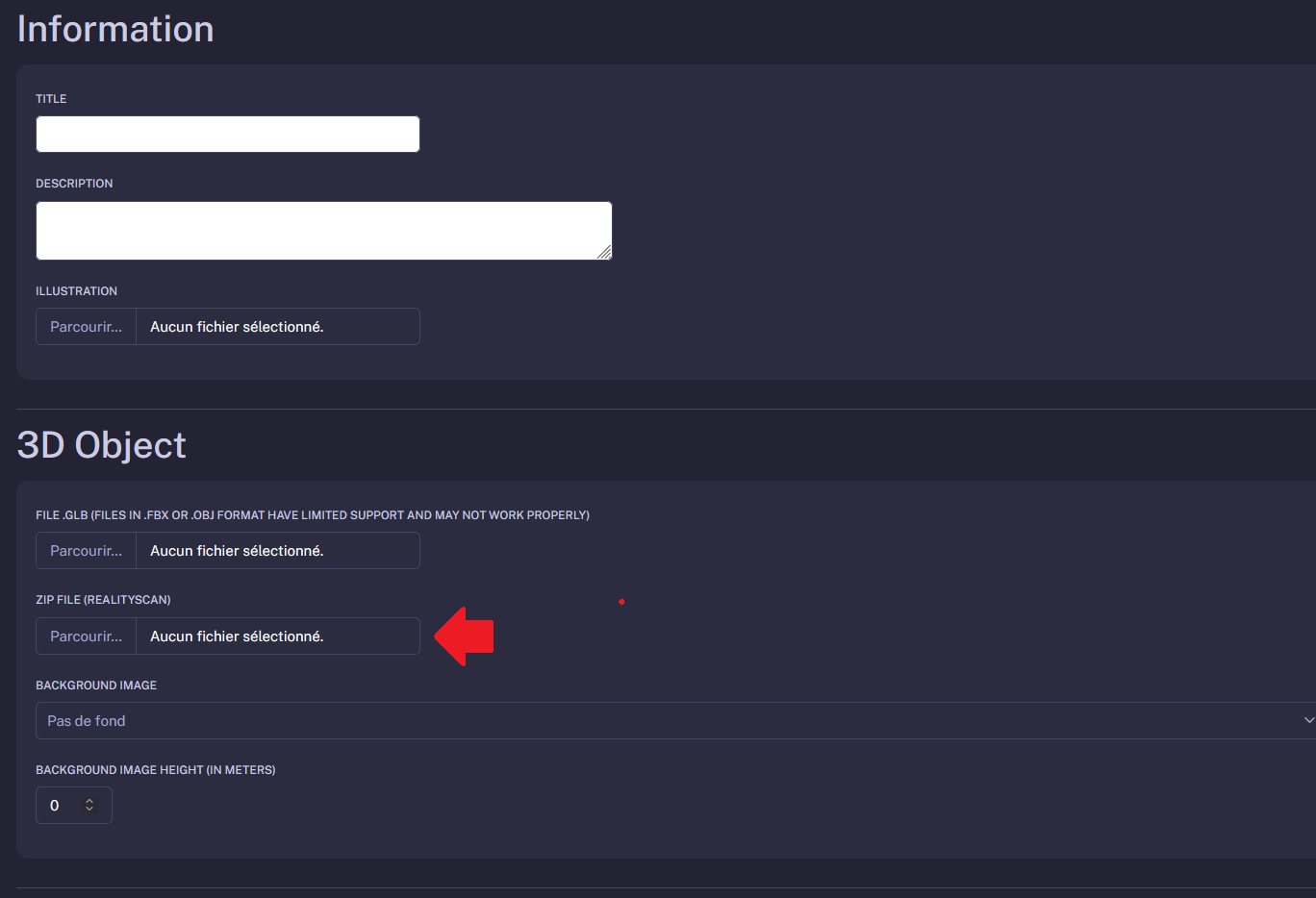 You’ll arrive on the upload page. Fill in the object description, upload the exported .zip file in the "RealityScan" field, and click "Validate".